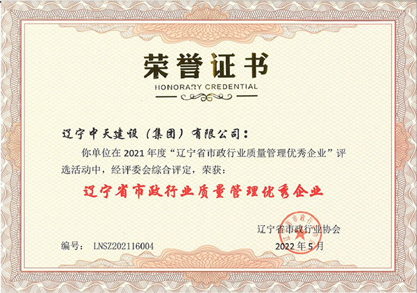 企業先后榮獲“全國優秀施工企業”、 “中國AAA級信用企業”、“全國保障性安居工程建設勞動競賽先進單位”、“遼寧省最受尊敬企業”、“遼寧省優秀建筑業企業”、“遼寧省工程建設質量管理優秀企業”、 “遼寧省守合同、重信用企業”、遼寧省“AAA級信用企業”、 “撫順市安全生產先進單位、紅旗單位”、“撫順市安康杯競賽先進集體”等多項殊榮。